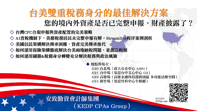 此外,李博容稅務師將於4月20、21、23、24日受邀出席臺北市美國信託傳承協會主辦之「台美稅務新紀元:高資產家族的跨境傳承布局」系列講座,深入解析境外資產揭露義務與Streamlined合規路徑,協助跨境家族掌握關鍵風險與因應策略。參加此系列座談之聽眾,現場將獲得安致勤資會計師集團3本著作。