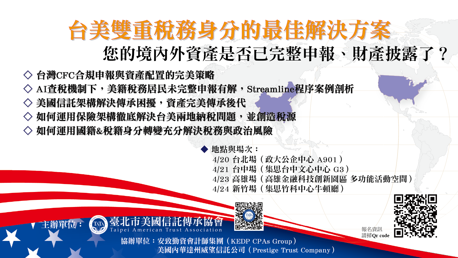深耕高淨值家族之跨境傳承佈局,專精於美國稅務申報與架構建置。除了協助年度合規申報,更具備處理美國國稅局(IRS)爭議函件的實戰經驗,確保客戶在法規框架下達成最佳揭露。憑藉豐富的實務底蘊及精準的跨境規劃,協助客戶實現資產的永續性與保全性;針對台灣本土具台美雙重身分之客戶,更能提供兼具國際視野與在地化思維的全方位稅務諮詢。